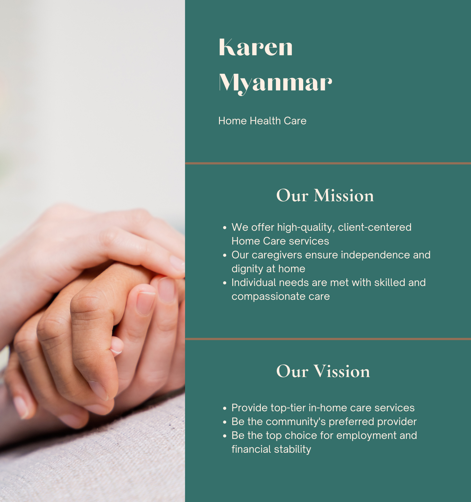 Karen Myanmar Home Health Care is a professional team of Care Experts serving you the best by filling patient needs. We will provide you with our best services; personalized care plans and offer support to maintain patient convenience, emotional comfort and wellness.
